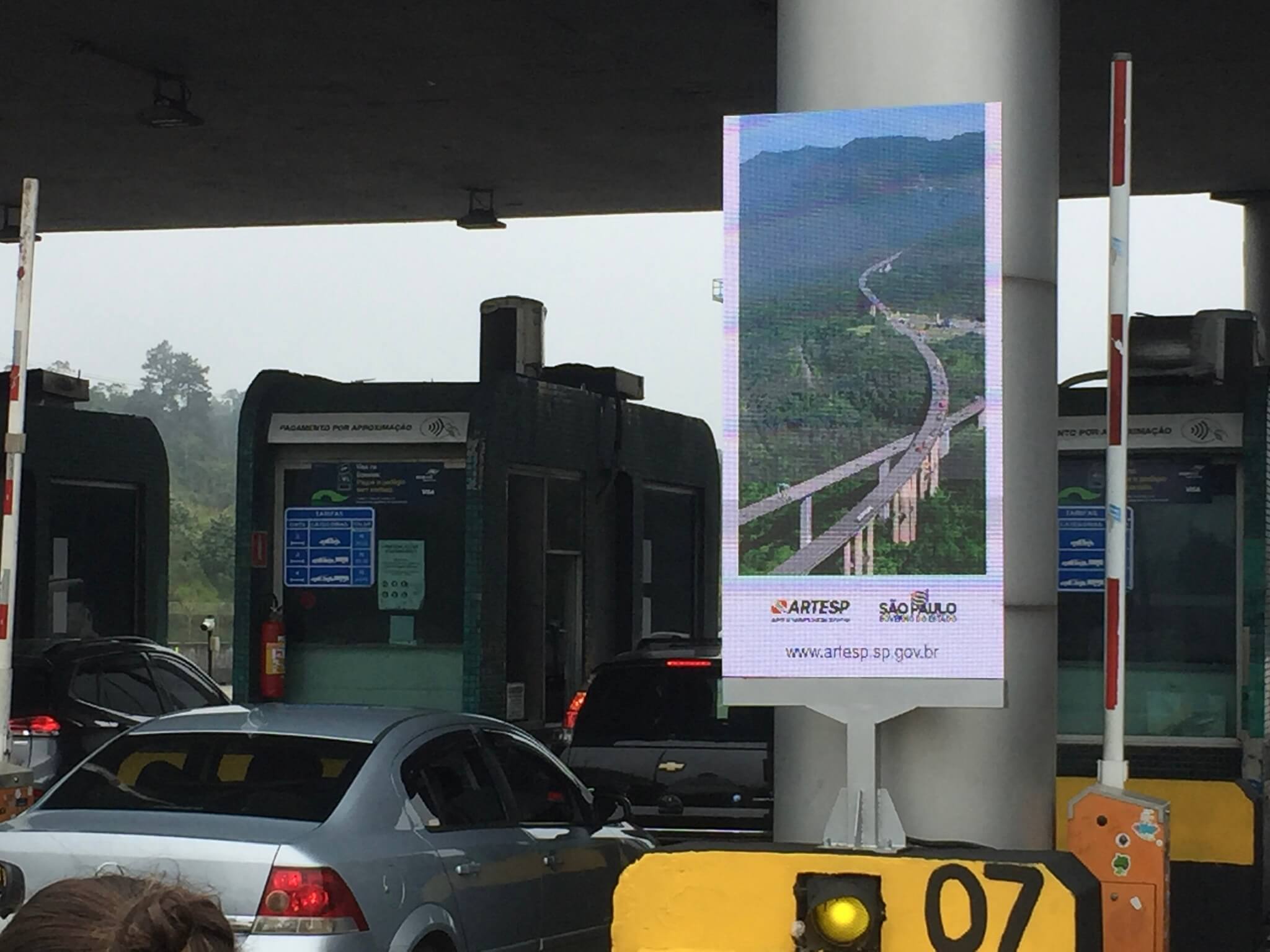 Num projeto inédito no estado de São Paulo, estamos instalando nossos painéis de led em todas as praças de pedágio da Ecovias / Ecorodovias, cobrindo inicialmente o Sistema Anchieta Imigrantes, criando um canal de comunicação para as marcas conversarem com o público que circula entre a Capital, o ABC e o Litoral Paulista, impactando 53 milhões de pessoas por ano.